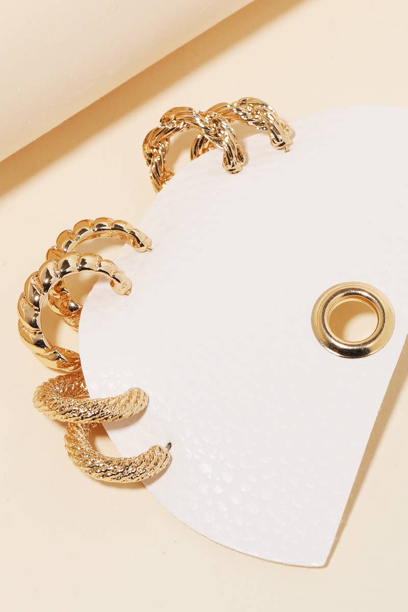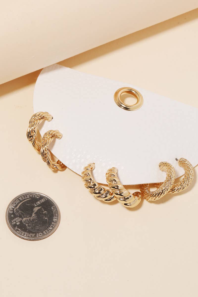 This is a must have pair of earrings have a assorted hoop twist earrings set design. Perfect for this Spring season! Available in G. This item is sold in packs of 1.