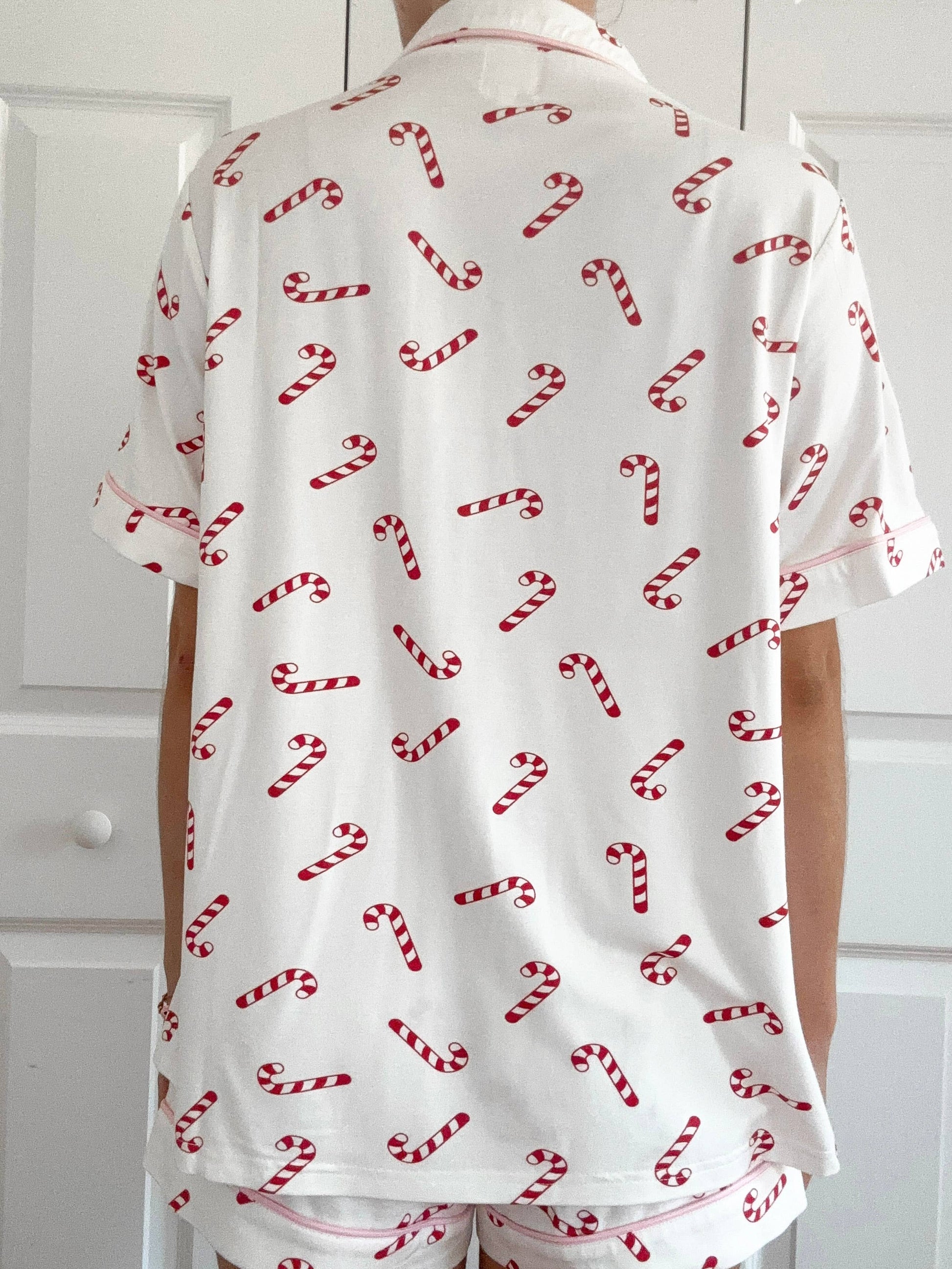 Candy Cane Holiday Christmas Short Sleeve Button Up Pajama Top