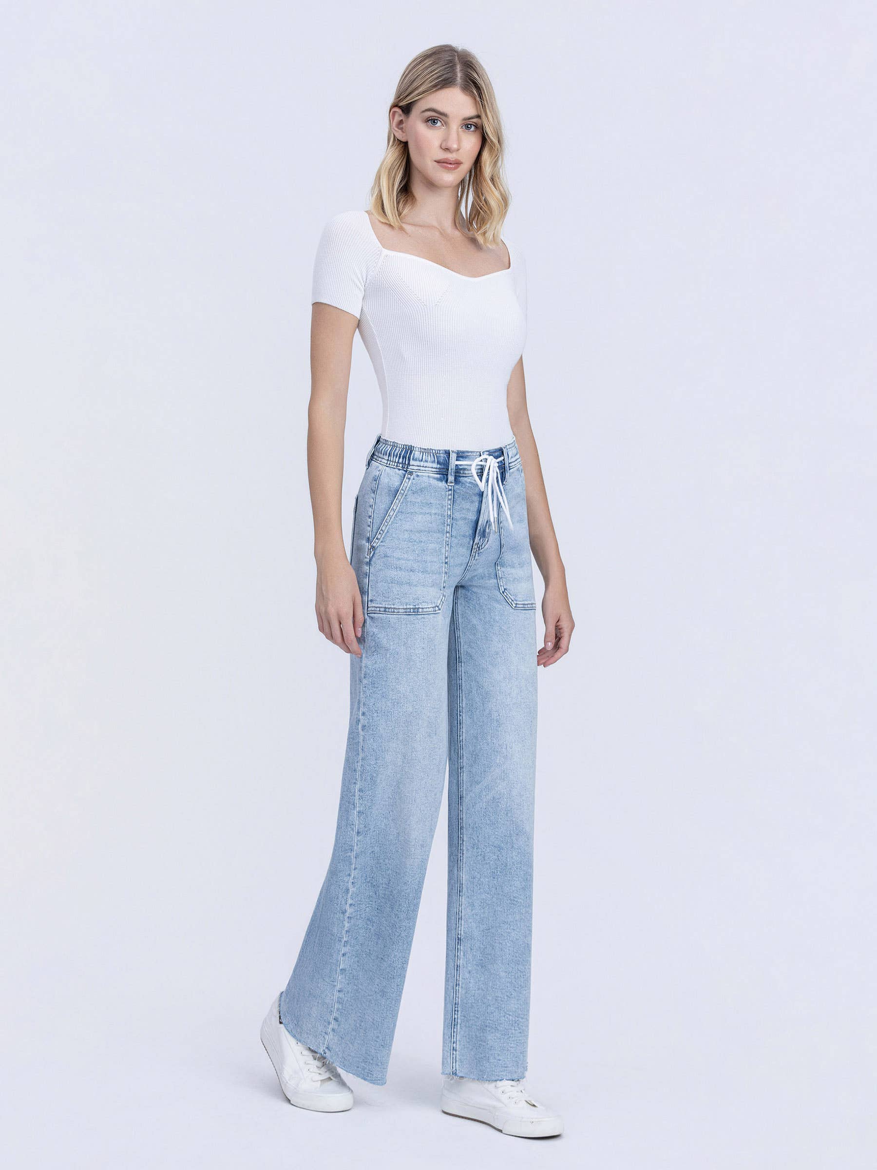 COMFORT STRETCH DENIM, HIGH RISE WAIST, DRAWSTRING WAISTBAND, UTILITY POCKET DETAIL, RAW HEM, FULL LENGTH, LIGHT WASH, WIDE LEG JEANS