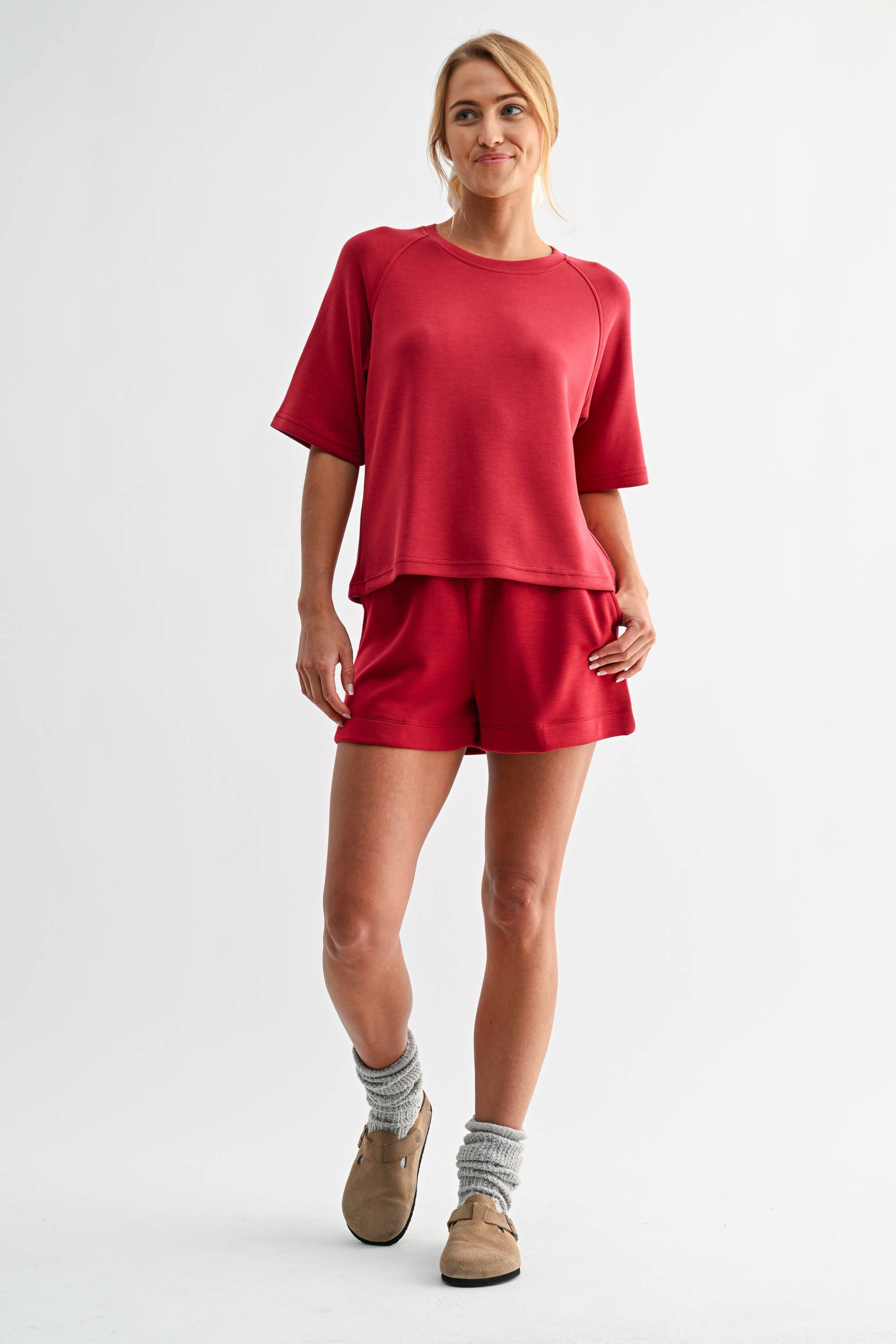 Effortless, elevated, and endlessly wearable. The Soft Drape Raglan Tee is crafted from a mid-weight modal blend jersey that feels silky to the touch and drapes just right. The raglan sleeve design adds a sporty edge, while the subtly relaxed fit flatters every frame. Whether you're dressing it up or keeping it casual, this tee is your new go-to for softness with a hint of structure.