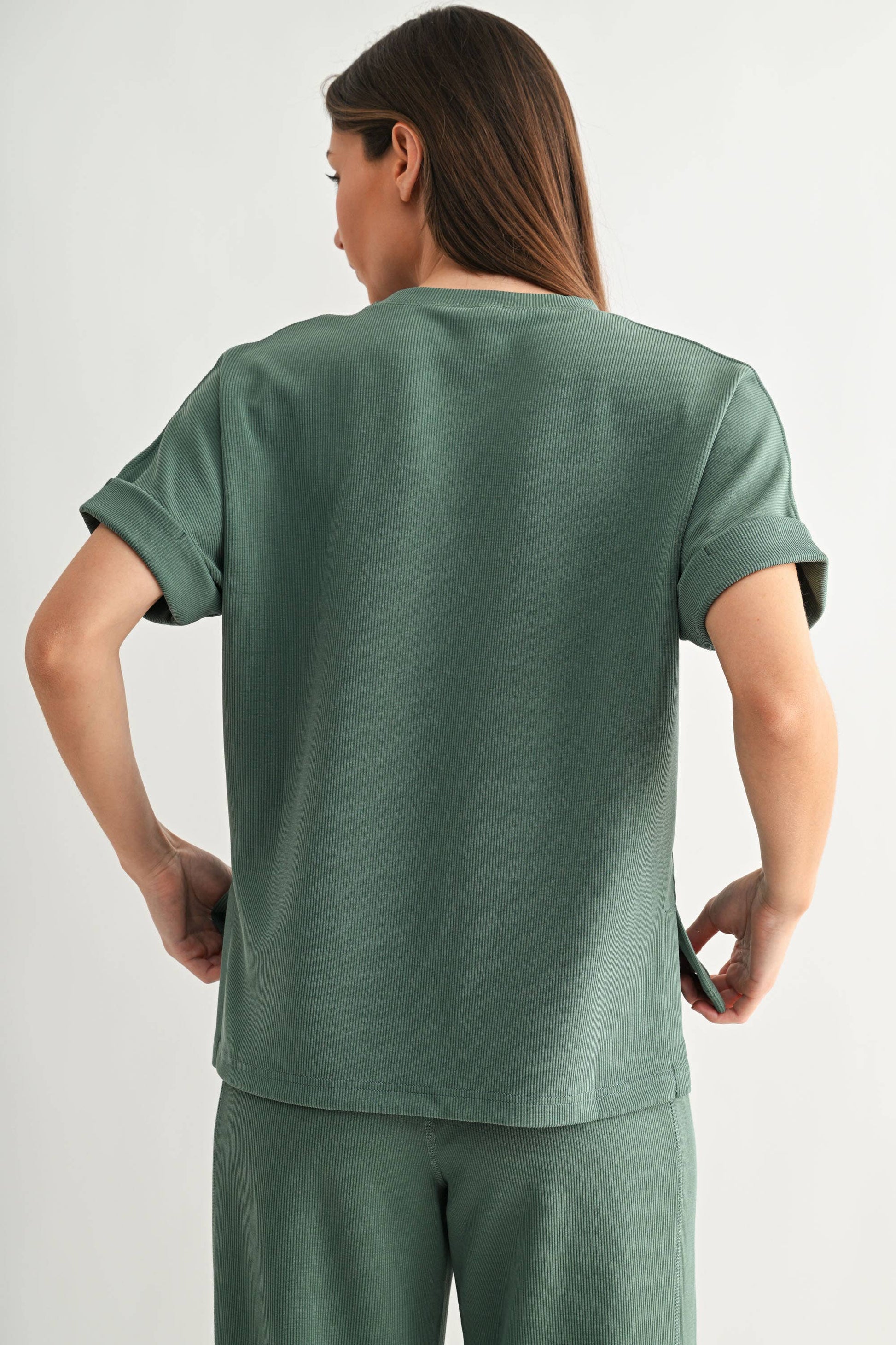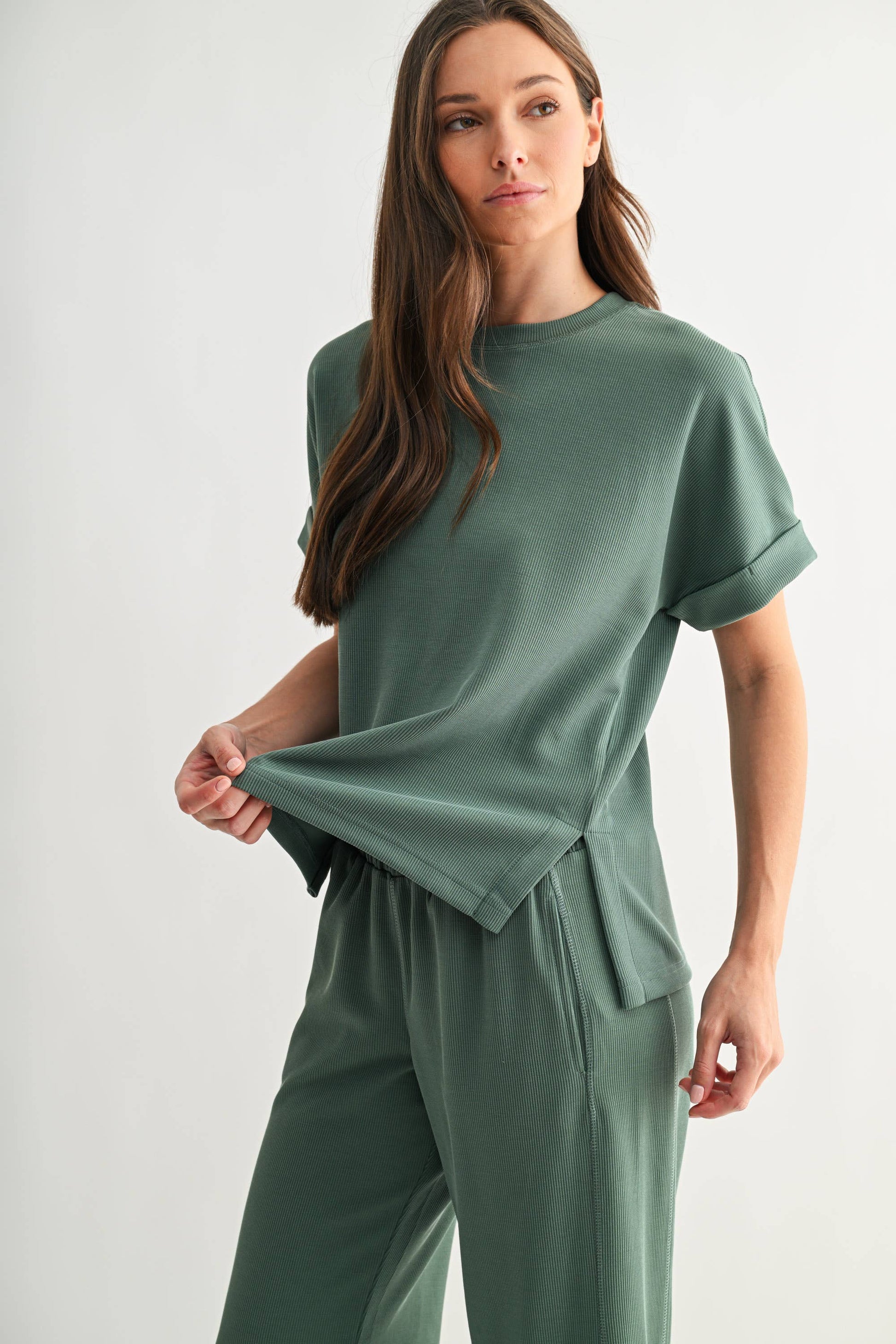 Easygoing and effortlessly soft, the Luxe Sand Wash Rib Lounge Tee is made from buttery-smooth, sand-washed rib fabric that feels as good as it looks. Designed with a relaxed fit, it features a classic crew neckline, sewn-down rolled sleeve cuffs, and subtle side slits with a slight high-low hem for that laid-back drape. Pair it with the matching Luxe Sand Wash Rib Lounge Shorts for a complete off-duty look. Liza is 5'9.5", a size 2, and is wearing an S 68% polyester 26% modal 6% spandex