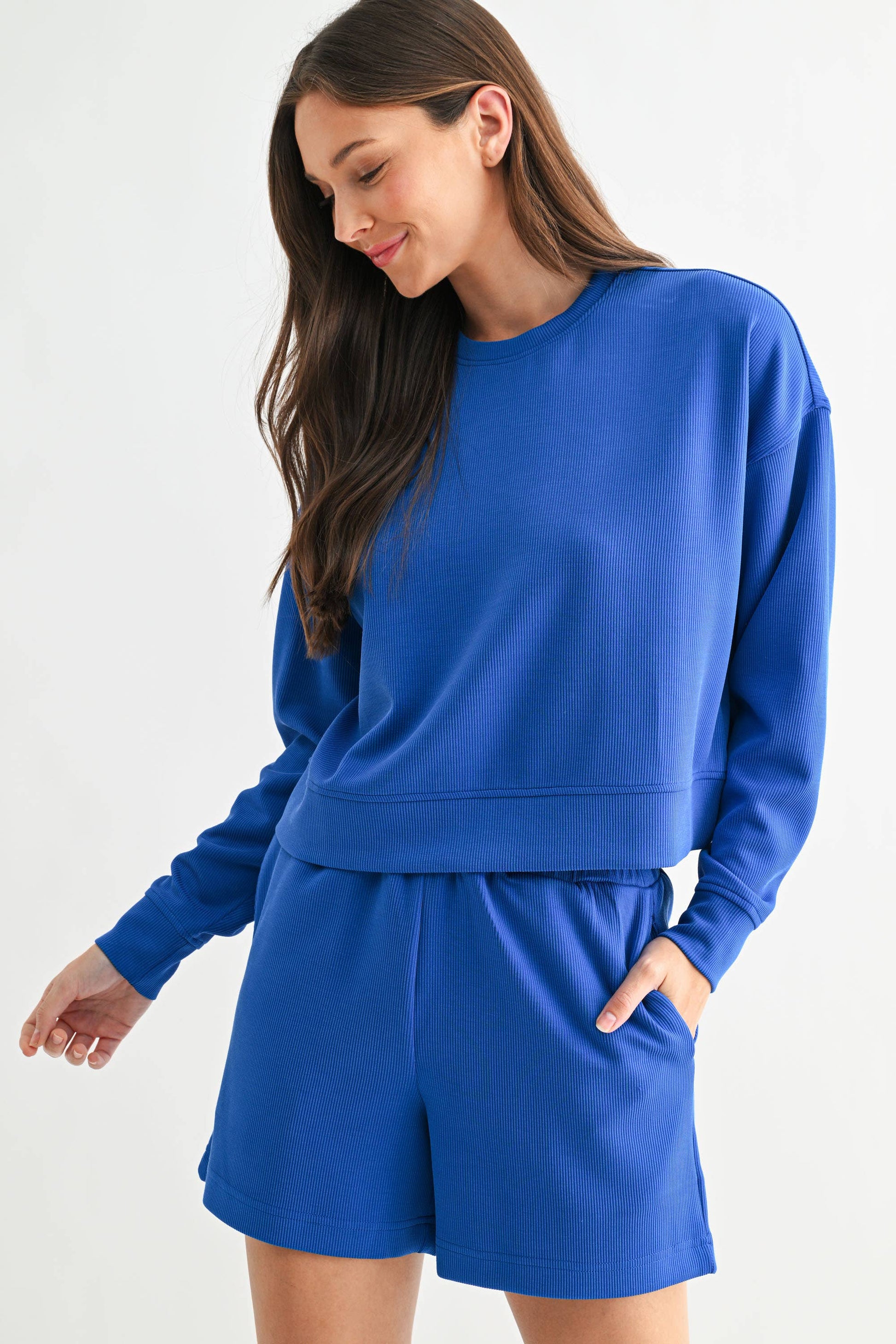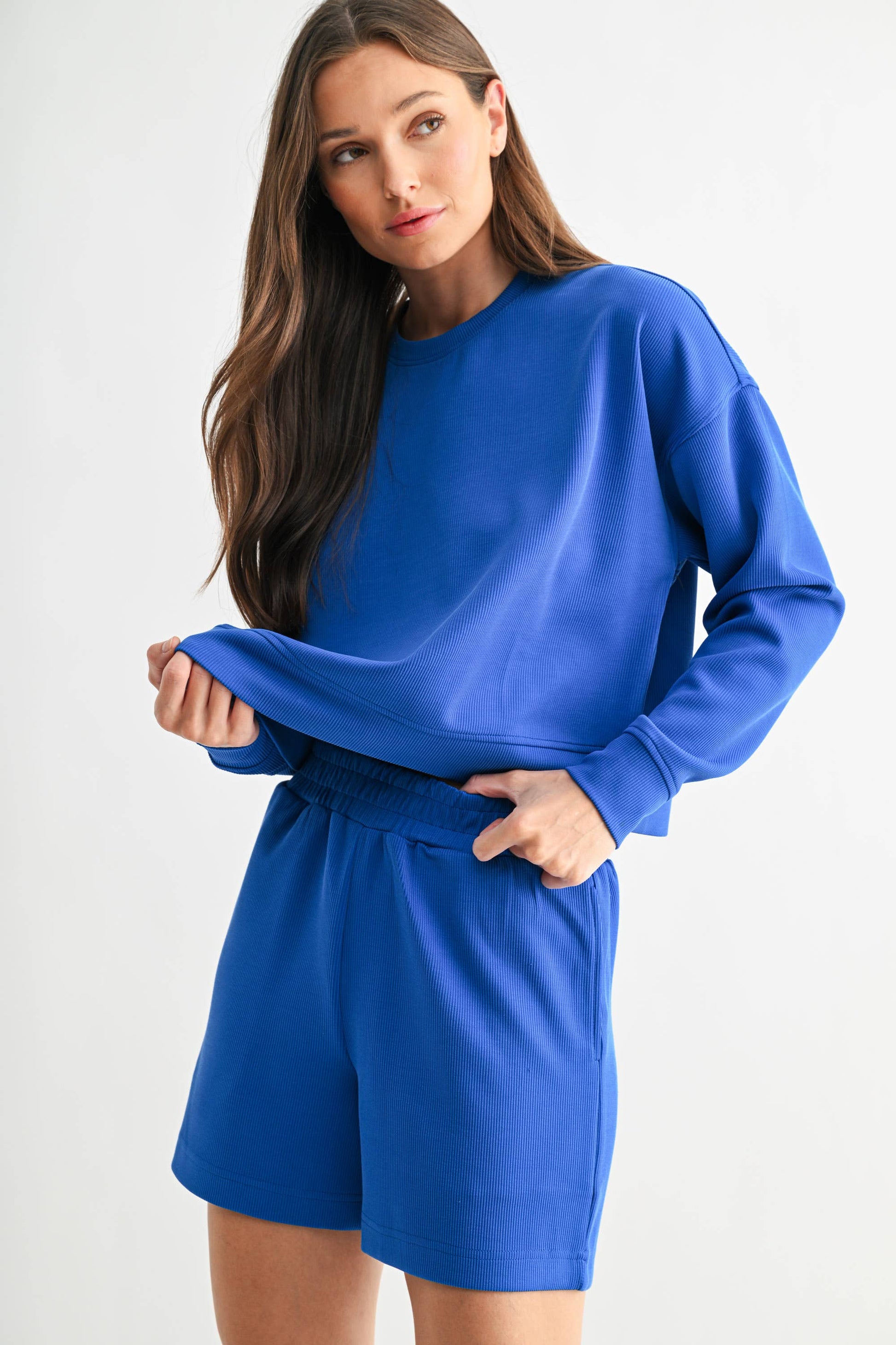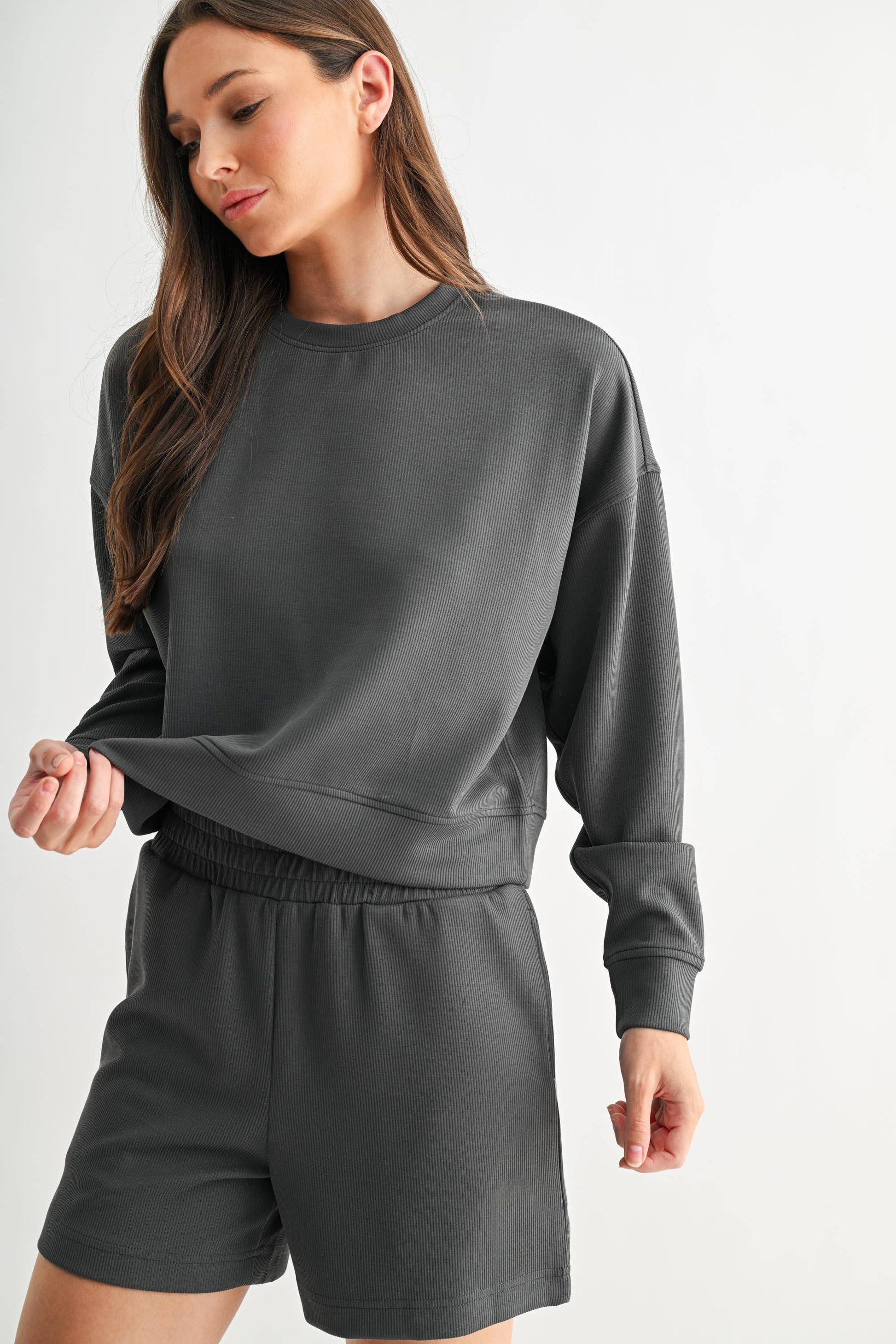 Effortlessly refined yet undeniably cozy, the Luxe Sand Wash Rib Sweater is a must-have for elevated comfort. Crafted from soft, sand-washed rib fabric, this sweater offers a rich texture that feels as luxe as it looks. The dropped shoulders and boxy fit create a relaxed, modern silhouette, perfect for layering or wearing solo. Designed for ultimate versatility, it pairs seamlessly with the matching Sand Wash Rib Pants (#KP5378) for a chic, coordinated set.